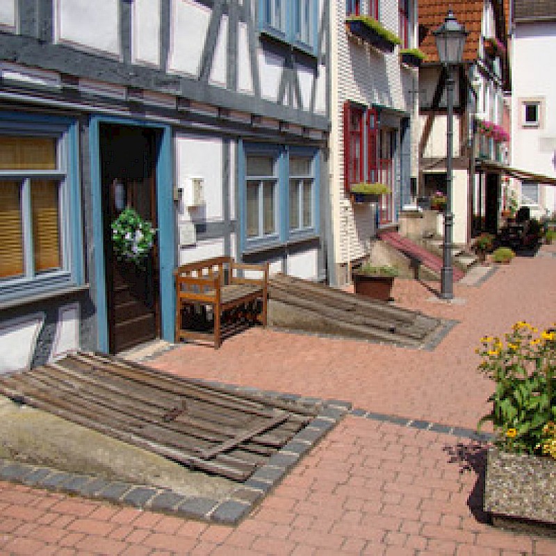 Hier bietet sich ein guter Eindruck von der Vielfalt der Bauformen und Baumaterialien des alten Steinau.