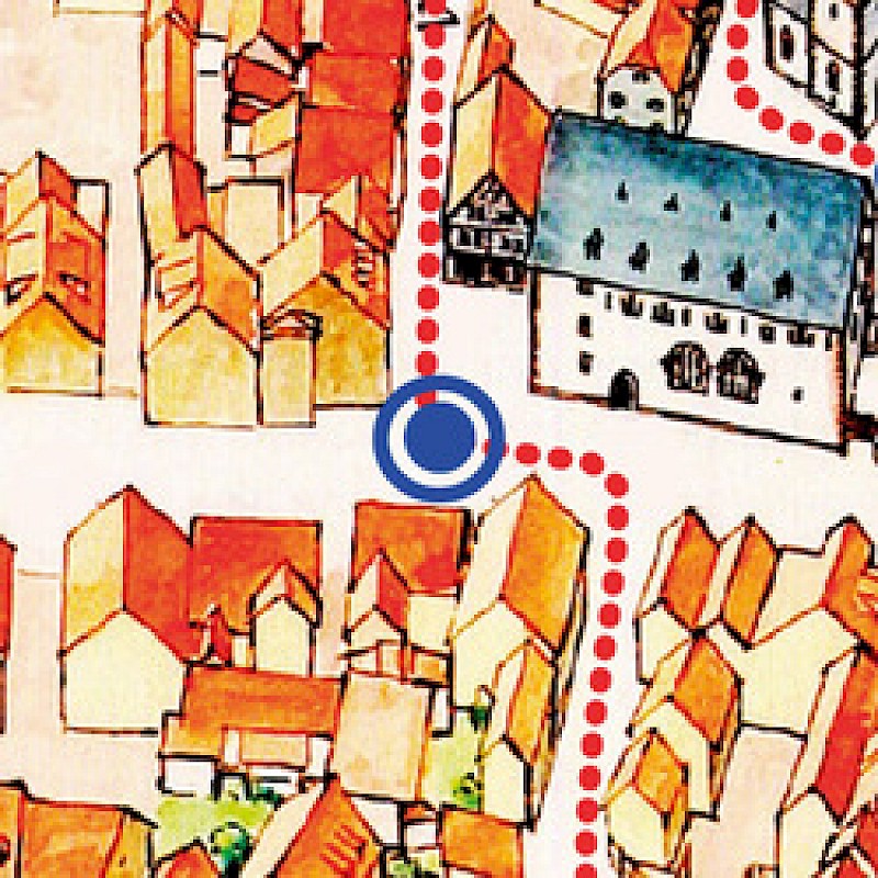 Von Ihrem jetzigen Standort aus können sie zwischen dem Marktplatz und dem früheren Obertor einen Abschnitt der alten Fernstraße gut übersehen. Hier reihten sich früher allein neun der einstmals 20 Gasthöfe und Herbergen der Stadt auf. Dazu kamen noch eine Reihe von Schankwirtschaften. Sie nahmen die vielen Kaufleute und Händler der Märkte über Nacht auf und bewirteten die Durchreisenden.