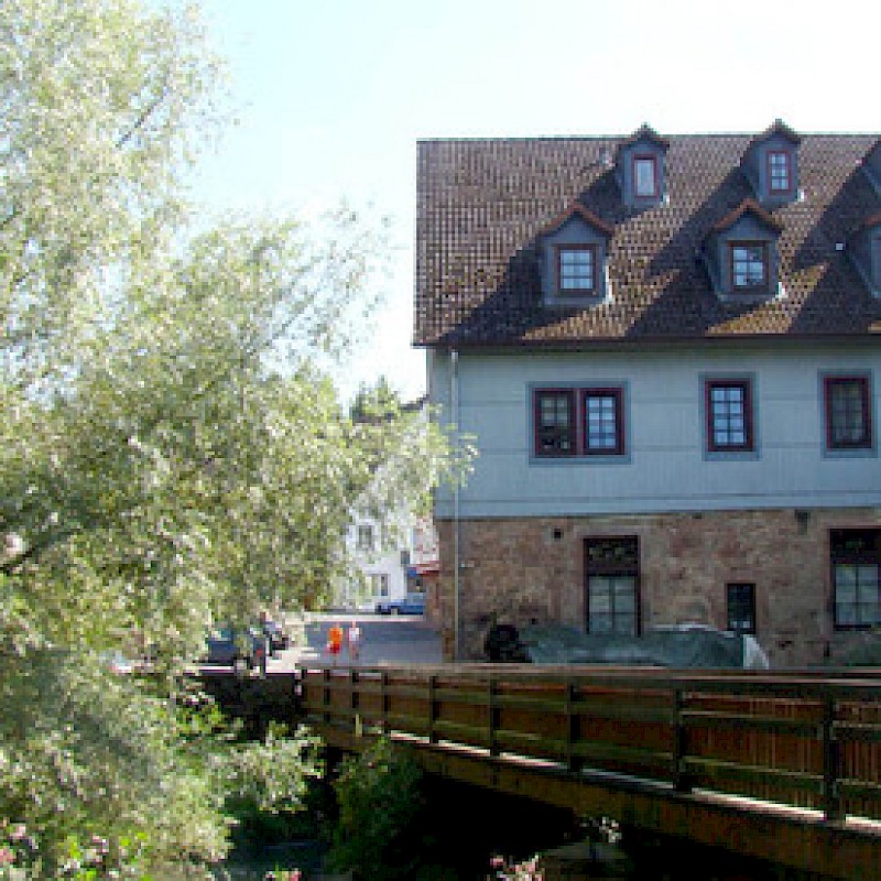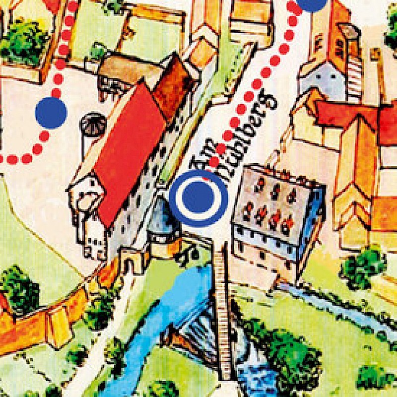 Die breite Gasse, in der wir uns jetzt befinden, begrenzt auf der rechten Seite die eindrucksvolle Rückfront des Amtshauses. Es wurde auf die innere Mauer gebaut. An dem hier noch gut erhaltenen Halbschalenturm ist aber zu erkennen, dass es hier früher noch eine vorgelagerte zweite Mauer gab und damit einen Zwinger. Gegenüber liegt das Anwesen der Herrenmühle.