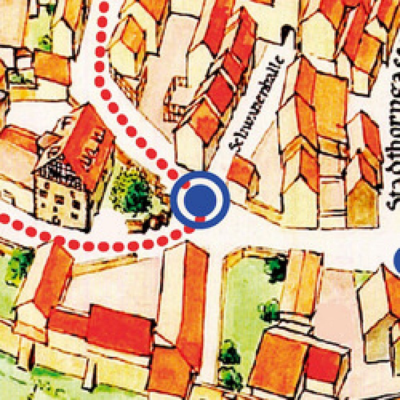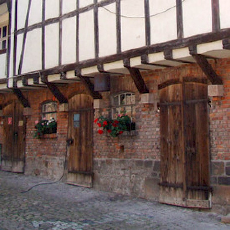 Wenn Sie sich umschauen, blicken Sie in einen der früheren Gasthaushöfe. Ein kurzes Stück in der Neugasse nach links liegt dort mit der „Schwanenhalle“ ein weiteres Beispiel. Am besten erhalten blieb der Hof mit ehemaligen Ställen und darüber liegender Galerie des Gasthofes „Zum weißen Ross“. Er liegt auf unserem weiteren Weg durch die Neugasse auf der rechten Seite.