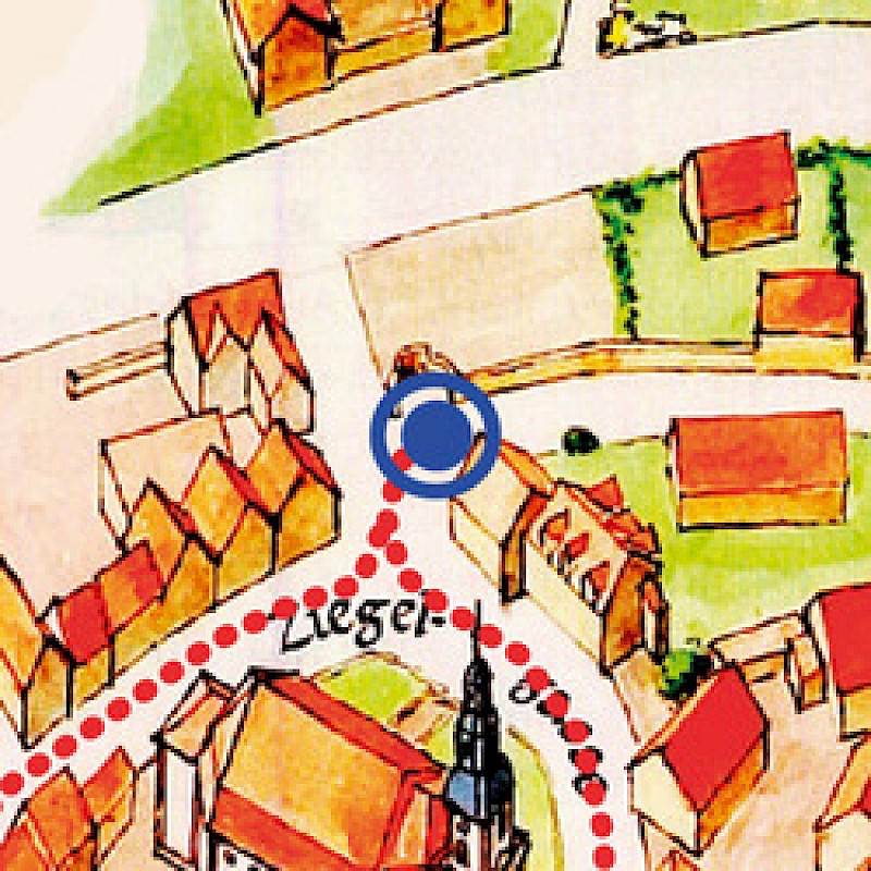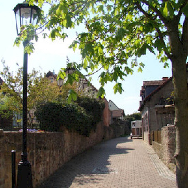 Die kleine Brunnenanlage wurde in einem der früheren Halbschalentürme angelegt. Von hier aus begleitet ein schmaler werdender Weg die Mauer. Er führt an einem der wenigen eckigen Türme vorbei zum Gelände des Viehhofs. Dort trifft er auf den älteren Mauerzug. Wenn Sie von dem Brunnen noch einige Schritte weiter bis zur Schlossstraße gehen, befinden Sie sich im Bereich des früheren Zwingers, das ist der Bereich zwischen der inneren und äußeren Stadtmauer.
